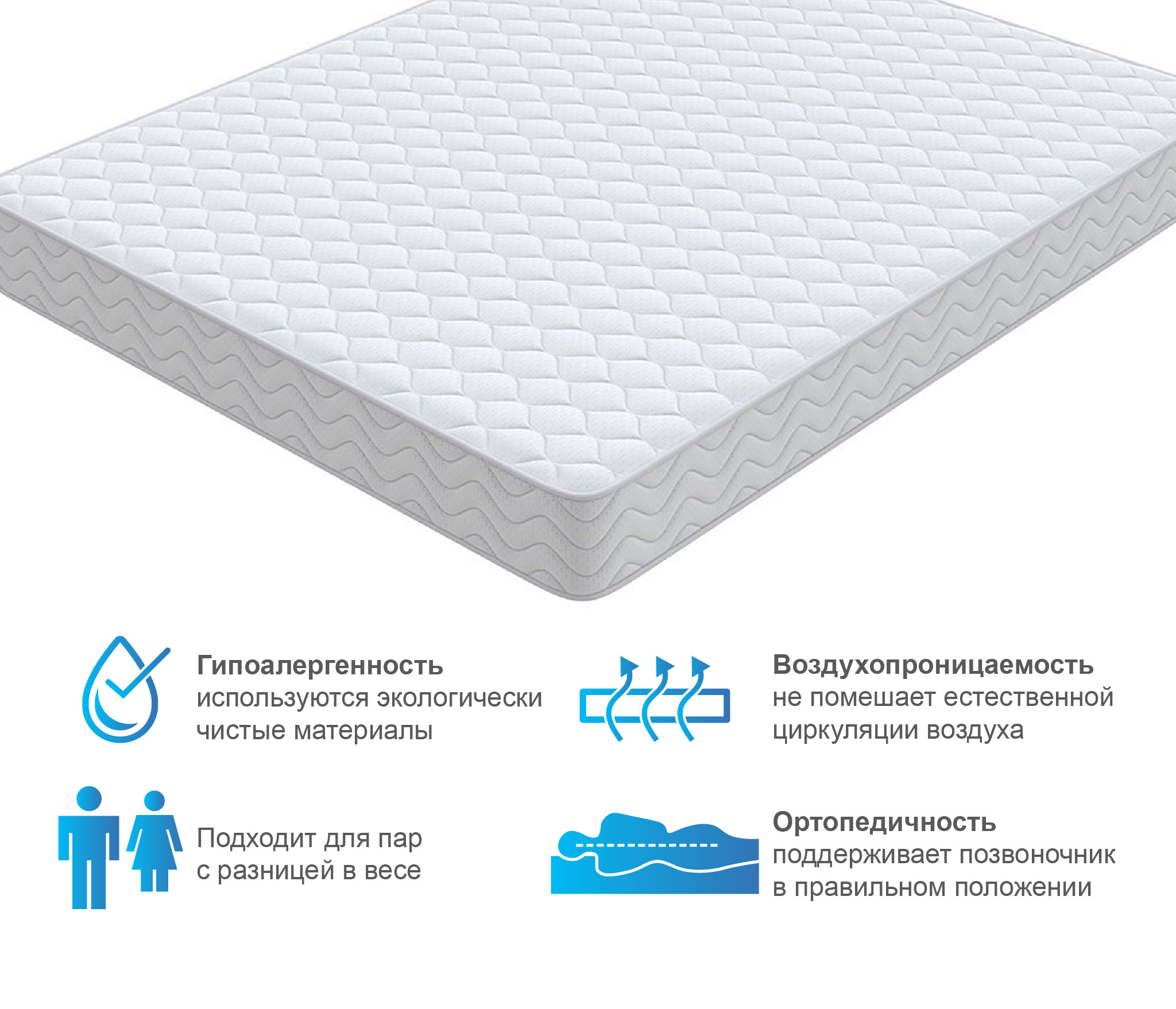 В основе матраса Спринг лежит классический пружинный блок Bonnell, который служит надежной опорой для позвоночника. Наполнитель из эластичного долговечного пенного материала делает матрас комфортным для сна и отдыха. Изолирующий слой из термовойлока придает дополнительную жесткость, а так же за счет своей объемной структуры способствует лучшей циркуляции воздуха.